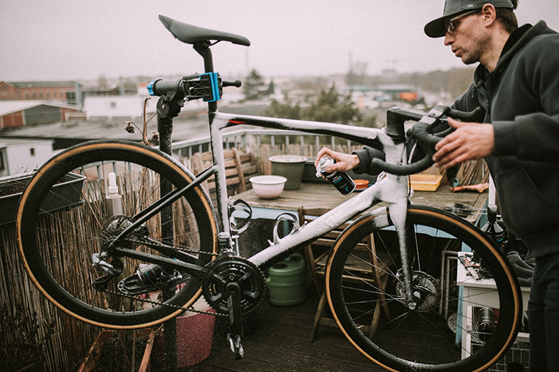 Sprühe das Dirt Destroy Spray direkt auf deinen Rahmen und die zu säubernden Fahrradteile. Lass es für 2-3 Minuten einwirken und spüle mit Wasser nach. Die Verschmutzungen werden einfach von deinem Bike gespült. Bei hartnäckigen Verschmutzungen benutze eine softe Bürste vor dem Abspülen. Das Dirt Destroy Spray kann auch hervorragend ohne Wasser angewendet werden, was insbesondere für E-Bikes von großem Vorteil ist. Den Schaum nach der Einwirkdauer einfach abwischen.
